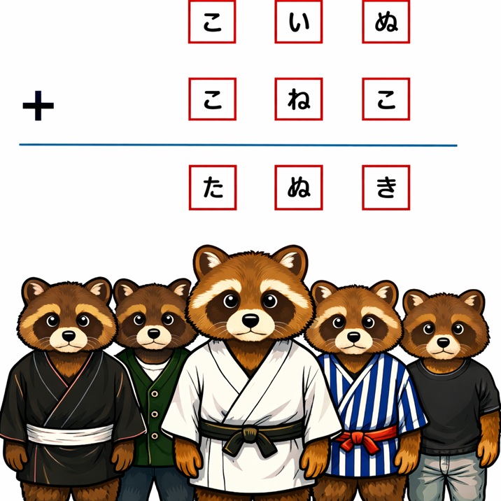 「こいぬ + こねこ = たぬき」は、6種類の平仮名 {い, き, こ, た, ぬ, ね} で構成された文字です。これらの平仮名 に、便宜上インデックス(番号)を割り振ります。ただし、ここで付ける番号は平仮名 に対応する数値ではなく、識別のためのインデックスです。混同を避けるため、インデックスは括弧書きで表記します。