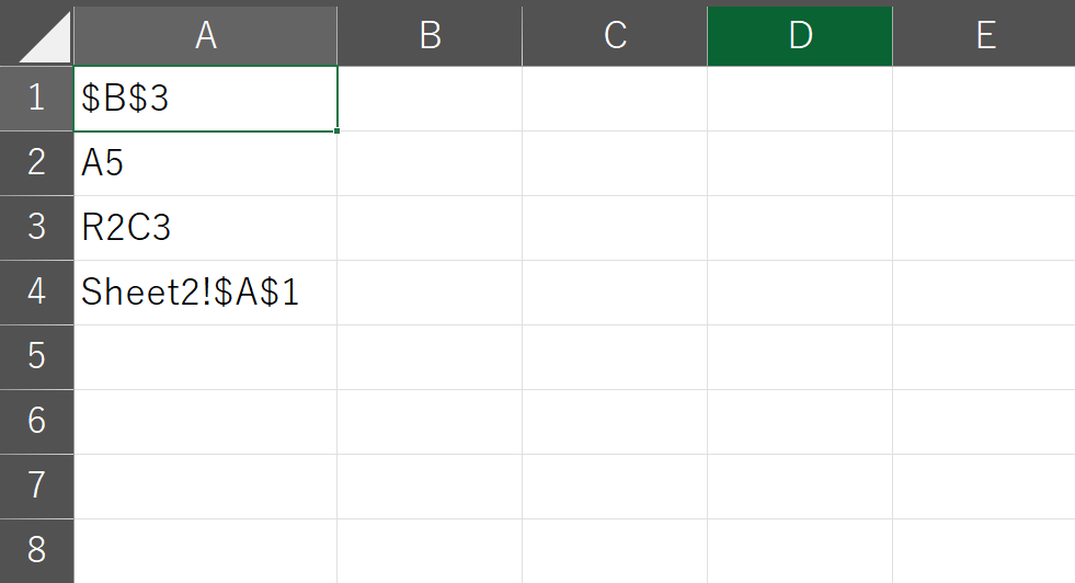 ・ a1:A1形式かR1C1形式か(省略可、TRUEでA1形式、FALSEでR1C1形式)