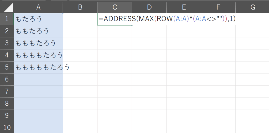 =ADDRESS(MAX(ROW(A:A)*(A:A<>"")),1)