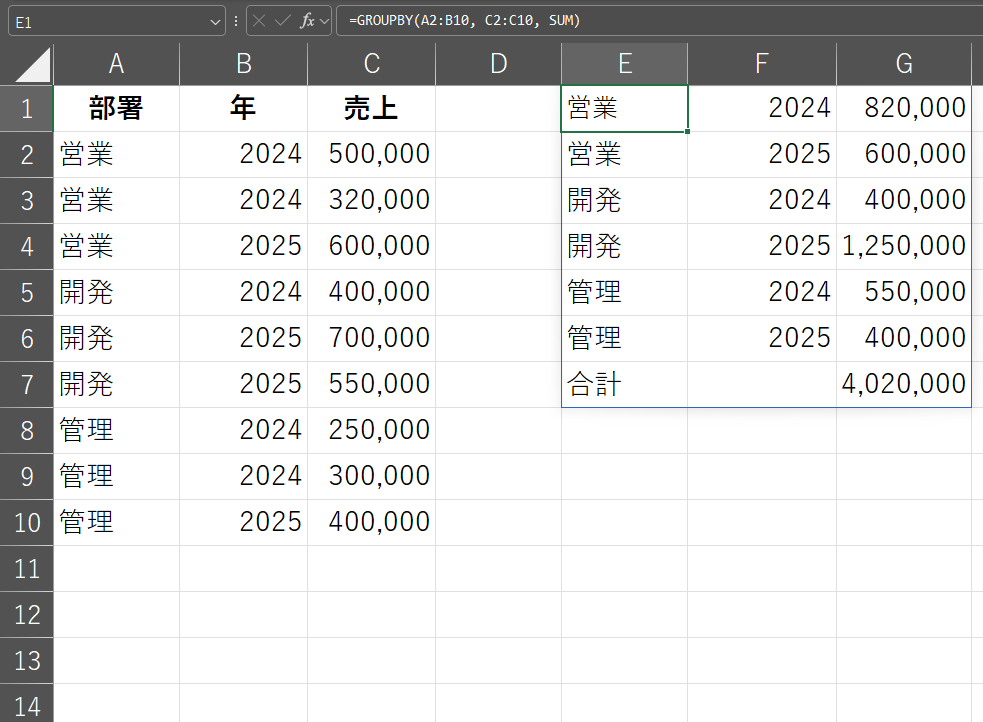 GROUPBY関数は、データを「行方向にグループ化」して合計・平均・件数などを返す動的配列関数です。ピボットテーブルのような集計を、1つの数式で作れます。