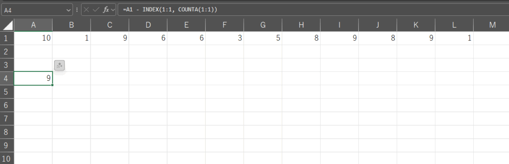 =A1 - INDEX(1:1, COUNTA(1:1))