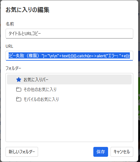 ④ 名前を「タイトルとURLコピー」にして、URL欄に JavaScript を貼り付ける。