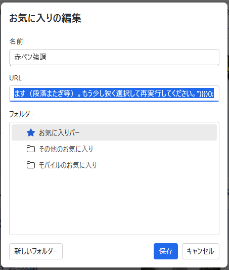 ④ 名前を「赤ペン強調」にして、URL欄に JavaScript を貼り付ける。
