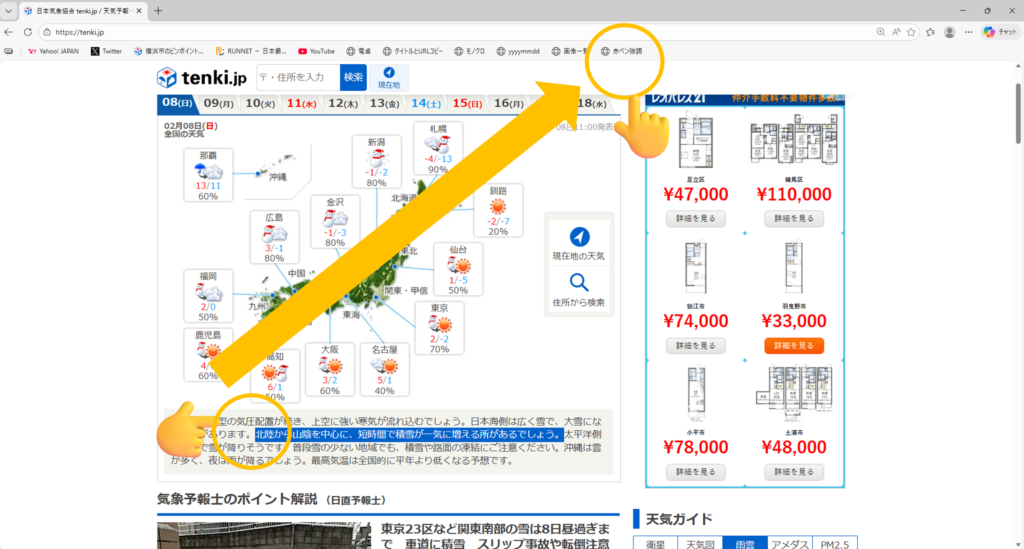 たとえば、、天気予報サイトで、強調したい文字を選択してからお気に入りをクリックすると…