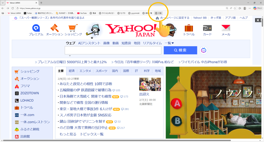 たとえば、、Yahoo!Japanのページを開いた状態でお気に入りをクリックすると…