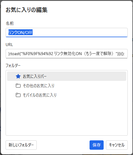 ④ 名前を「リンクON/OFF」にして、URL欄に JavaScript を貼り付ける。