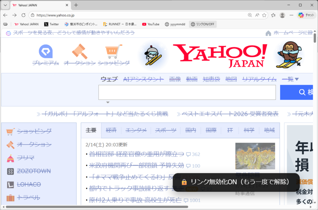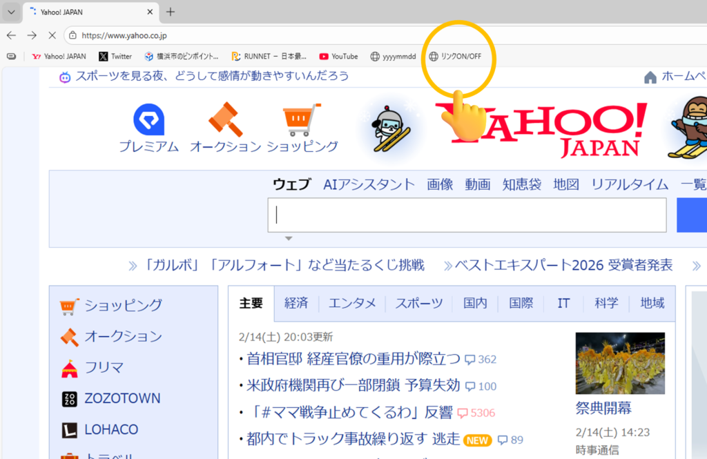 たとえば、、Yahoo!Japanのページを開いた状態でお気に入りをクリックすると…