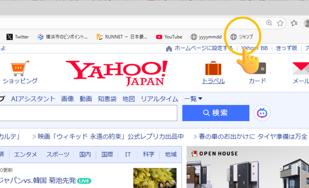 たとえば、、Yahooのページを開いた状態でお気に入りをクリックすると…