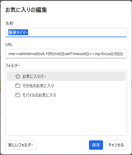 ④ 名前を「爆弾タイマー」にして、URL欄に JavaScript を貼り付ける。