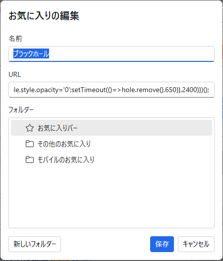 ④ 名前を「ブラックホール」にして、U」にして、URL欄に JavaScript を貼り付ける。