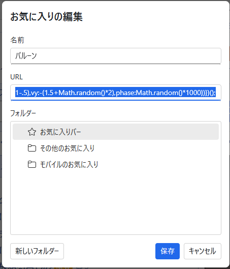 ④ 名前を「バルーン」にして、URL欄に JavaScript を貼り付ける。