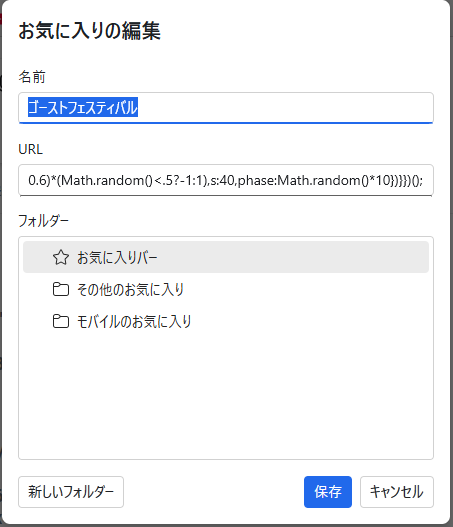 ④ 名前を「ゴーストフェスティバル」にして、URL欄に JavaScript を貼り付ける。