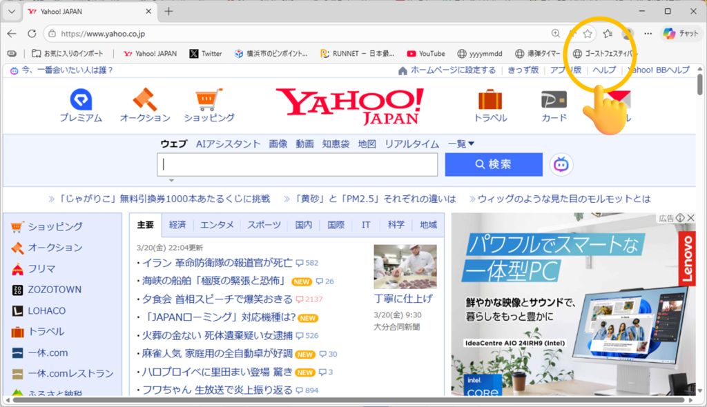 たとえば、Yahooページでお気に入りをクリックすると…