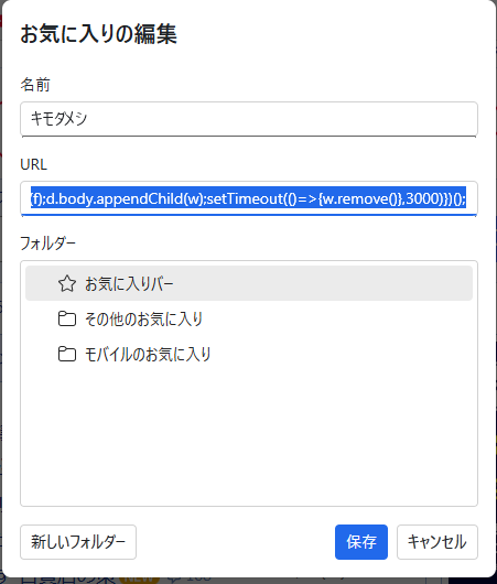 ④ 名前を「キモダメシ」にして、URL欄に JavaScript を貼り付ける。